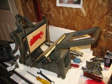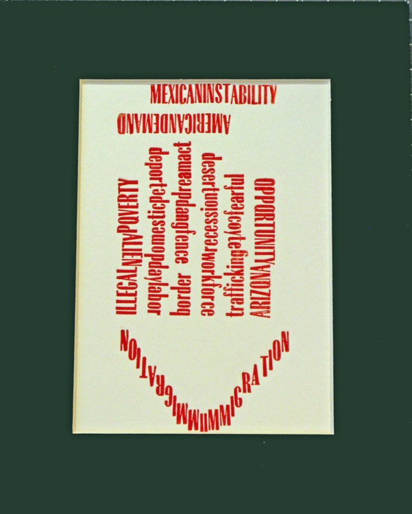 Below: Letterpress Prop Card Cover on paper 3" x 5" - 72pt Phenix Type and two cuts.