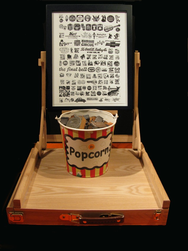 Proof print of a batch of vintage Letterpress Cuts sitting on a metal Popcorn Bucket full of Cuts
