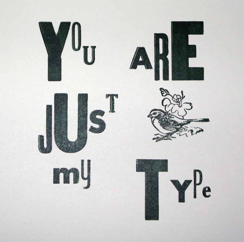 Below: Printed on the Golding Pearl Letterpress on 6" x 6" Paper - Mixed type. Entitled: "He's a Printer, She's a Birder"